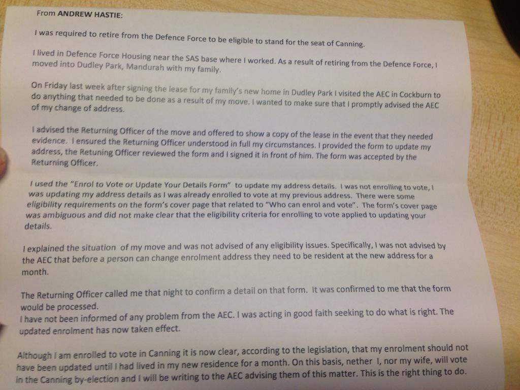 In true Lieberal couldn't-organise-a chook-raffle style, Handrew Hastie has fucked up his voting enrolment in the Canning by election. You know, the one where he wants everyone to vote for him to save Abbott's political ass.